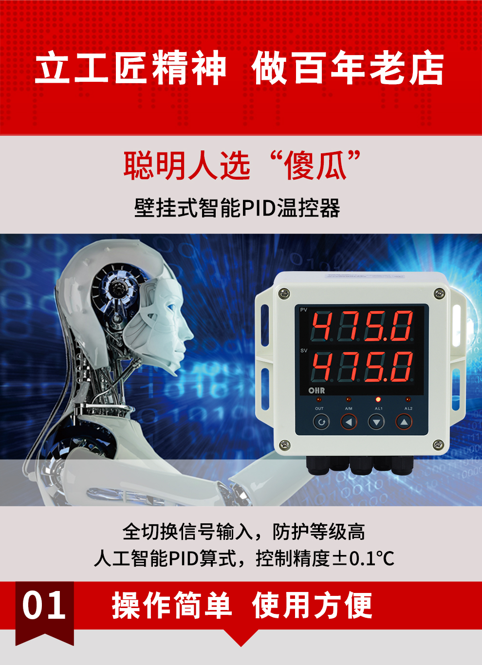 OHR-BG30/BG40系列壁掛式智能溫控器/60段程序溫控器采用了表面貼裝工藝,全自動貼片機生產(chǎn),具有很強的抗干擾能力。本儀表采用人工智能算式,儀表啟動自整定功能,可以根據(jù)被控對象的特性,自動尋找參數(shù)以達到很好的控制效果,無需人工整定參數(shù),控溫精度基本達±0.2℃,無超調(diào)、欠調(diào),性價比高。