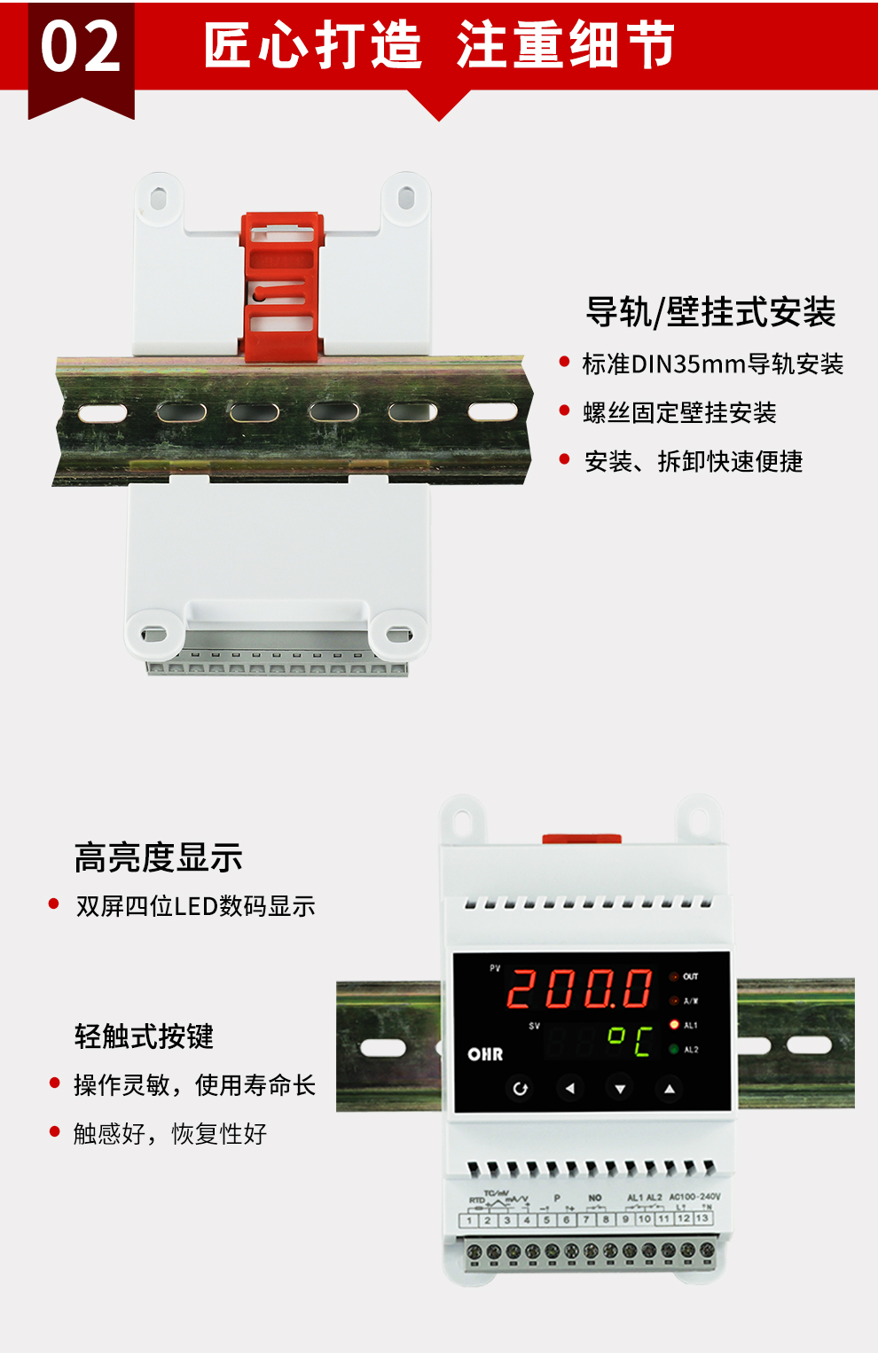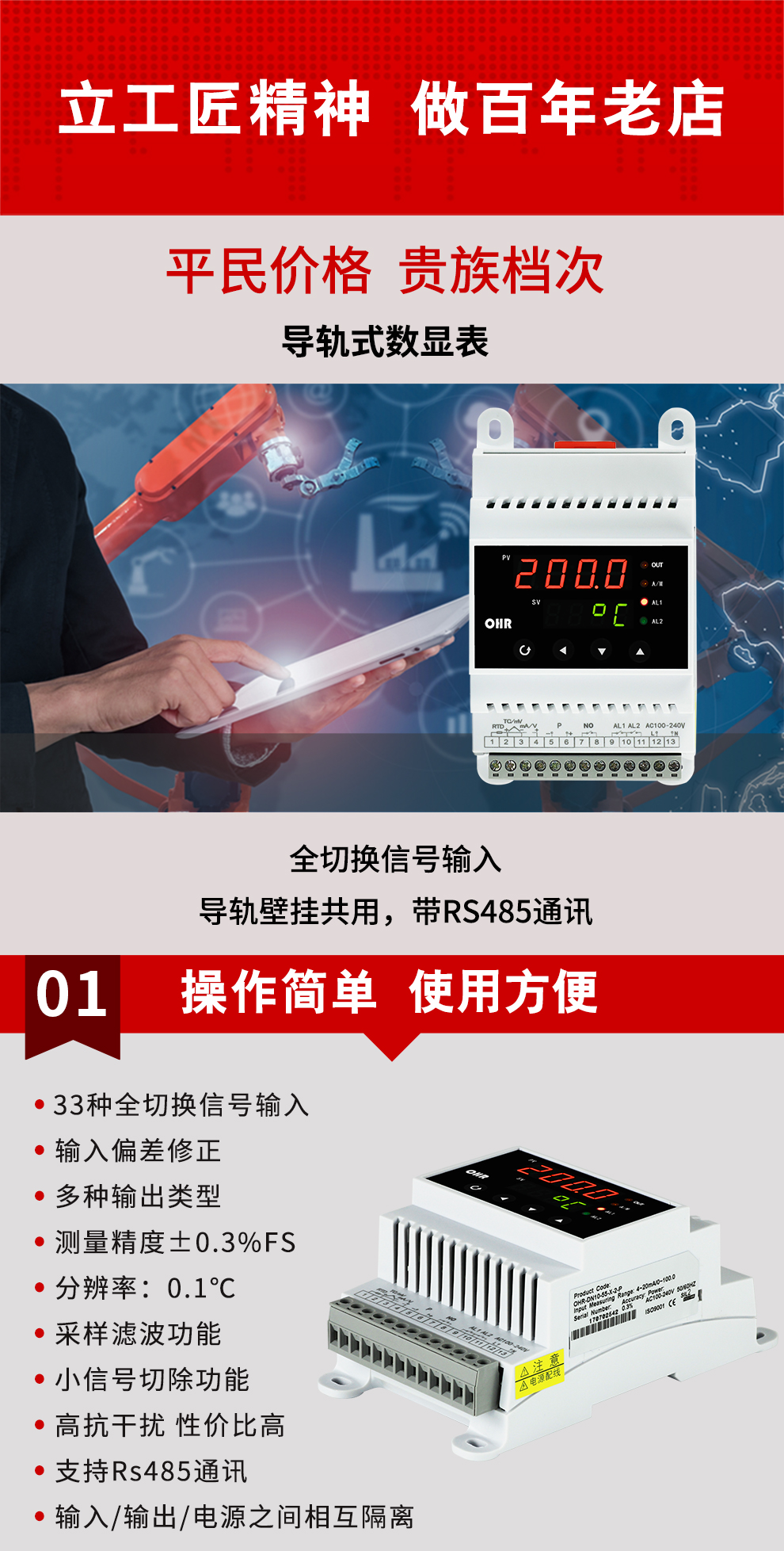 OHR-DN10系列導(dǎo)軌式數(shù)字顯示控制儀采用了表面貼裝工藝,全自動貼片機生產(chǎn),具有很強的抗干擾能力??蓪囟?、壓力、液位等工業(yè)過程參數(shù)進(jìn)行測量、顯示、報警控制、變送輸出、數(shù)據(jù)采集及通訊。
