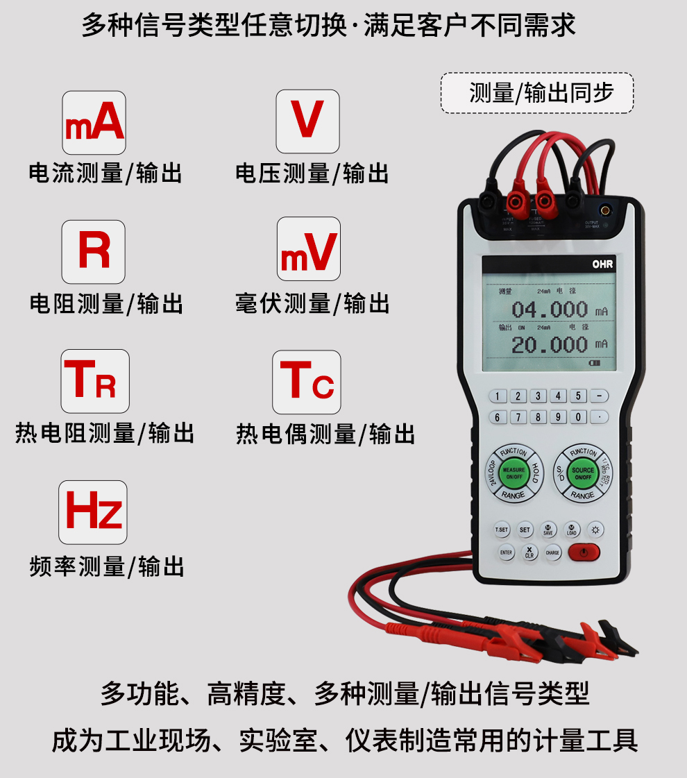 OHR-A00過程校驗儀是一種多功能、高精度的便攜式儀器,可用于校準(zhǔn)、測試工業(yè)過程裝置及各種電氣設(shè)備,支持電流、電壓、電阻、頻率、熱電偶、熱電阻等多種信號類型,最高精度可達(dá)0.01%F.S,是工業(yè)現(xiàn)場、實驗室以及各類儀表制造商必備的計量測試工具。