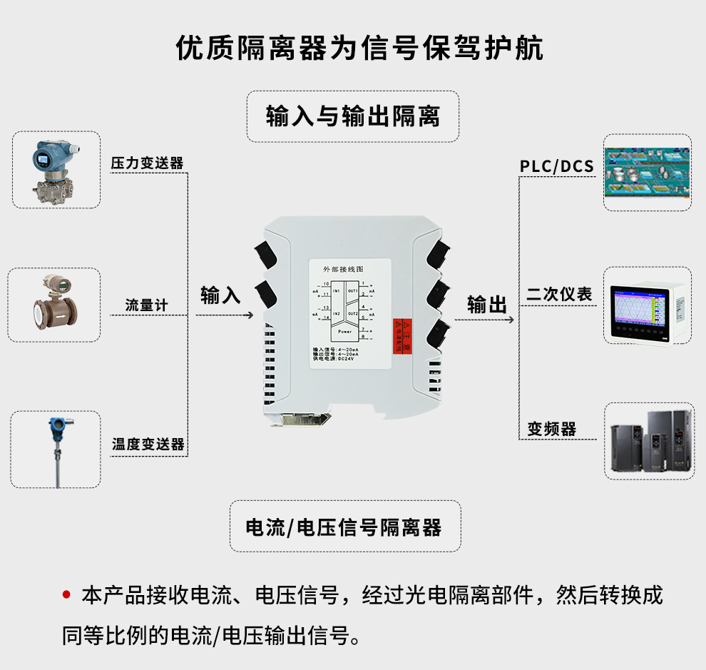 OHR-M31系列智能隔離器將直流電壓或電流信號經過隔離傳送,轉換成所需的信號給其它儀表??梢耘c單元組合儀表及DCS、PLC等系統(tǒng)配套使用,給予現(xiàn)場儀表信號隔離、信號轉換、信號分配、信號處理等,從而提高工業(yè)生產過程自動控制系統(tǒng)的抗干擾能力,保證系統(tǒng)的穩(wěn)定性和可靠性。