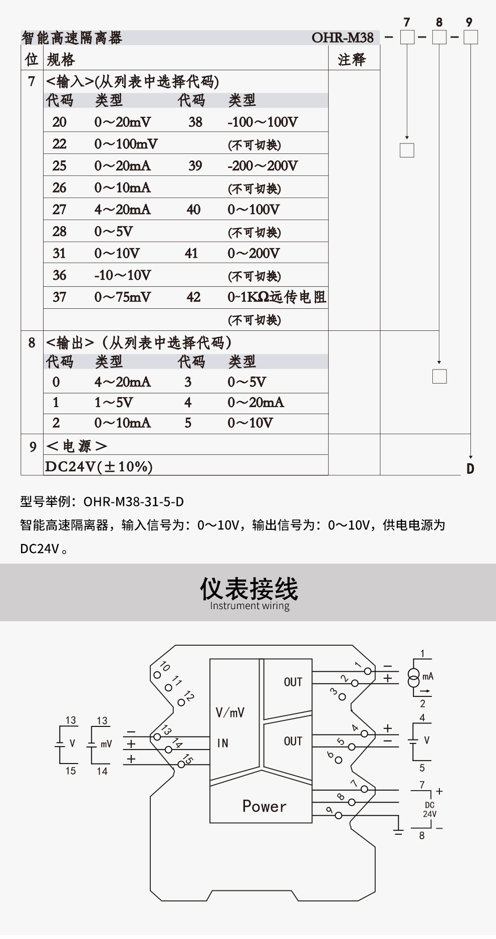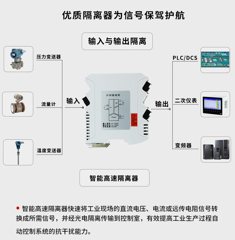OHR-M38系列智能高速隔離器將工業(yè)現(xiàn)場(chǎng)的直流電壓、電流或遠(yuǎn)傳電阻信號(hào)轉(zhuǎn)換成所需信號(hào),經(jīng)隔離傳輸?shù)娇刂剖?,有效提高工業(yè)生產(chǎn)過程自動(dòng)控制系統(tǒng)的抗干擾能力。