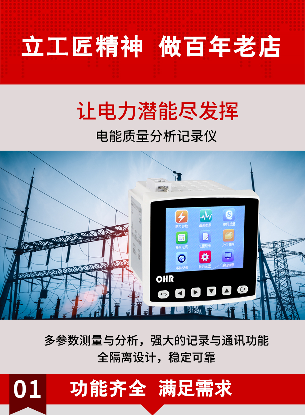 OHR-C900系列電能質量分析記錄儀采用新進的集成電路及數(shù)字采樣技術,對三相電氣線路中的交流電流/電壓、 有功功率、無功功率、視在功率、功率因數(shù)、工頻周波、諧波、有功電能、無功電能、四象限電能、波峰系數(shù) 及不平衡度等進行實時測量顯示與在線分析。
