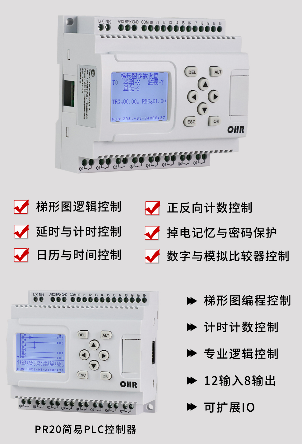 OHR-PR20系列簡易PLC控制器是一款結(jié)構(gòu)緊湊功能強大的控制器,集繼電器、定時器、計數(shù)器、日歷、時間開關(guān) 等功能于一體,可用于小規(guī)模應(yīng)用自動化系統(tǒng)。