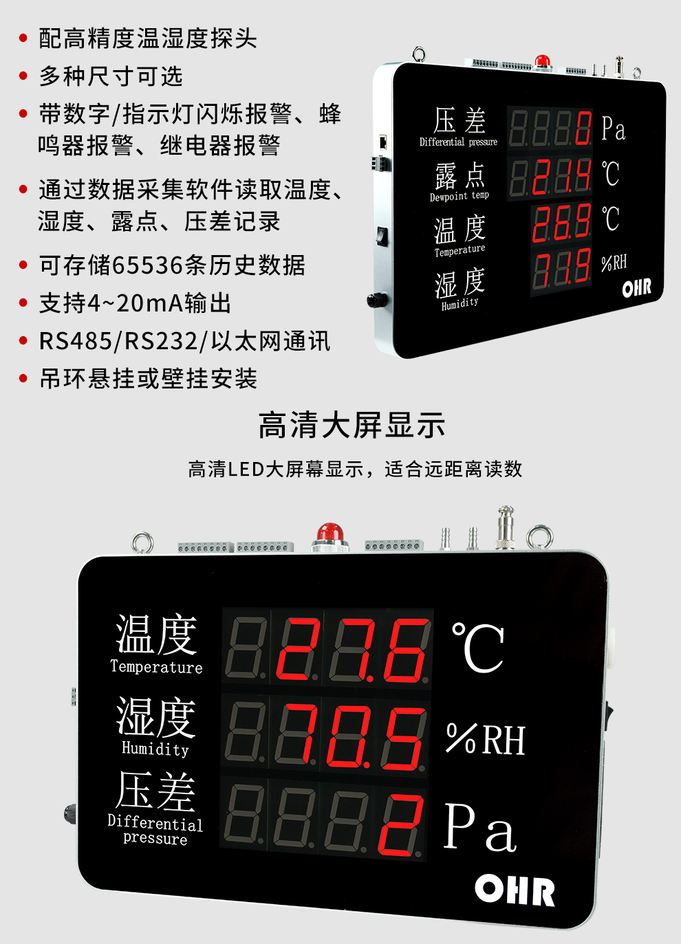 OHR-WS56/WS57系列大屏壓差溫濕度記錄儀采用高精度的采集電路及進(jìn)口傳感器,對環(huán)境的壓差、溫濕度 等進(jìn)行實(shí)時(shí)監(jiān)測、報(bào)警與記錄。本產(chǎn)品采用鋁合金邊框,高品質(zhì)亞克力面板,外觀美觀大方;大屏幕LED 數(shù)碼管顯示,醒目、便捷,實(shí)時(shí)顯示壓差值、溫濕度值和露點(diǎn)值等信息;可選配RS485、RS232通訊接口或 以太網(wǎng)通訊接口,通過配套的上位機(jī)軟件讀取歷史記錄。