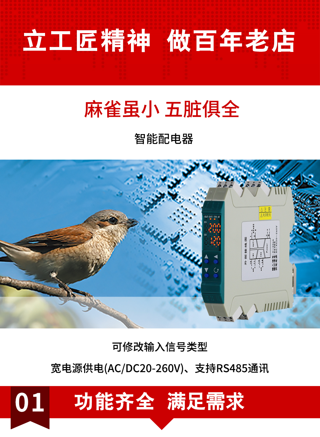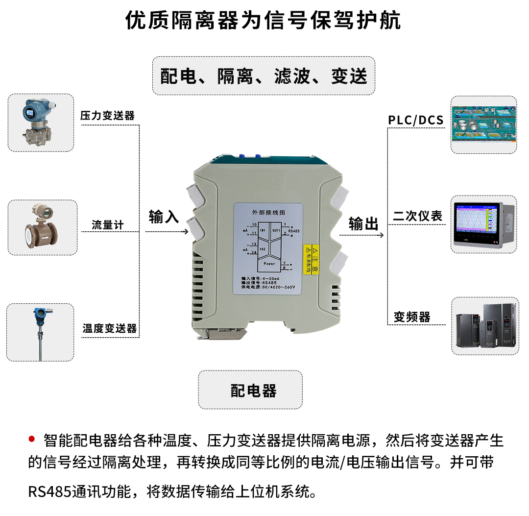 NHR-X33系列導(dǎo)軌式智能配電器給二、三線制變送器提供隔離的電源電壓,將變送器產(chǎn)生的直流電壓電流信號(hào),經(jīng)本隔離器轉(zhuǎn)換成所需的輸出信號(hào)至控制系統(tǒng)。寬電源設(shè)計(jì):20-260V交直流供電。配置高清顯示單元,通過輕觸按鍵設(shè)置每個(gè)通道的參數(shù)及每個(gè)通道之間的切換。