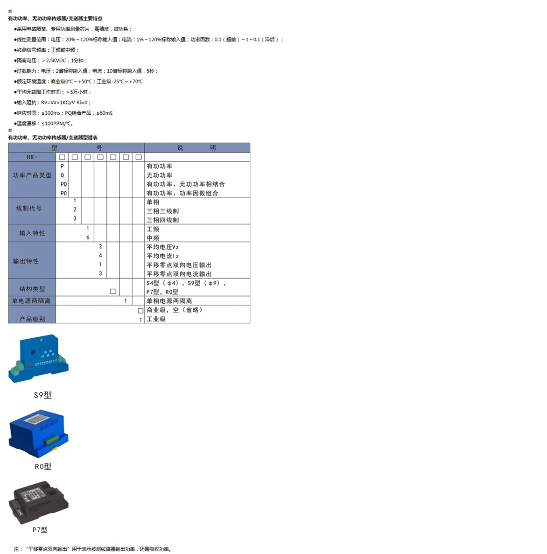 有功功率、無(wú)功功率傳感器/變送器是一種將電網(wǎng)中的有功功率/無(wú)功功率隔離變送成線性的直流模擬信號(hào)的裝置。該產(chǎn)品采用電磁隔離、專用功率測(cè)量芯片,高精度,微功耗。